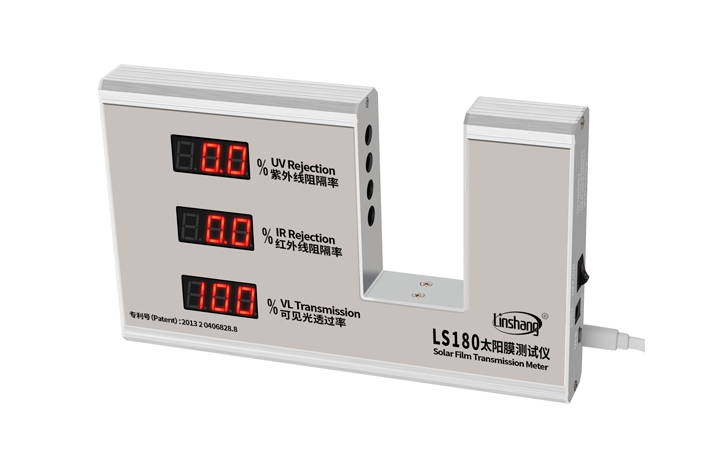 LS180太陽膜測試儀的測試原理是采用紫外光源,可見光源和紅外光源照射被測透明物質,感應器分別探測三種光源的入射光強和透過被測透明物質后的光強,透過光強與入射光強的比值即為透過率,用百分數表示。大多數的太陽膜,可見光標注透過率指標,紅外線和紫外線標注阻隔率指標,阻隔率=100%-透過率。